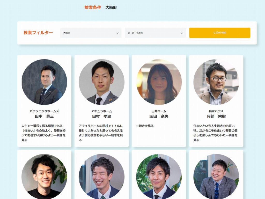 建築希望地や予算などの希望情報を入力し、さっそく「担当者を探す」から大阪の営業担当を探しました。